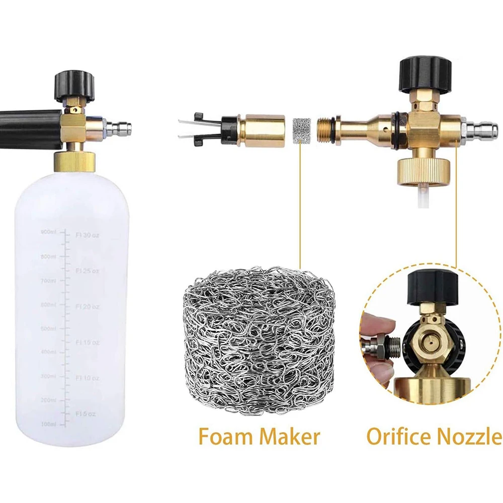 Warm notice: please screw in the orifice nozzle tighten enough, or it is hard to get thick foam; The nozzle tips and foam maker will be a nice combination to help you work more efficient